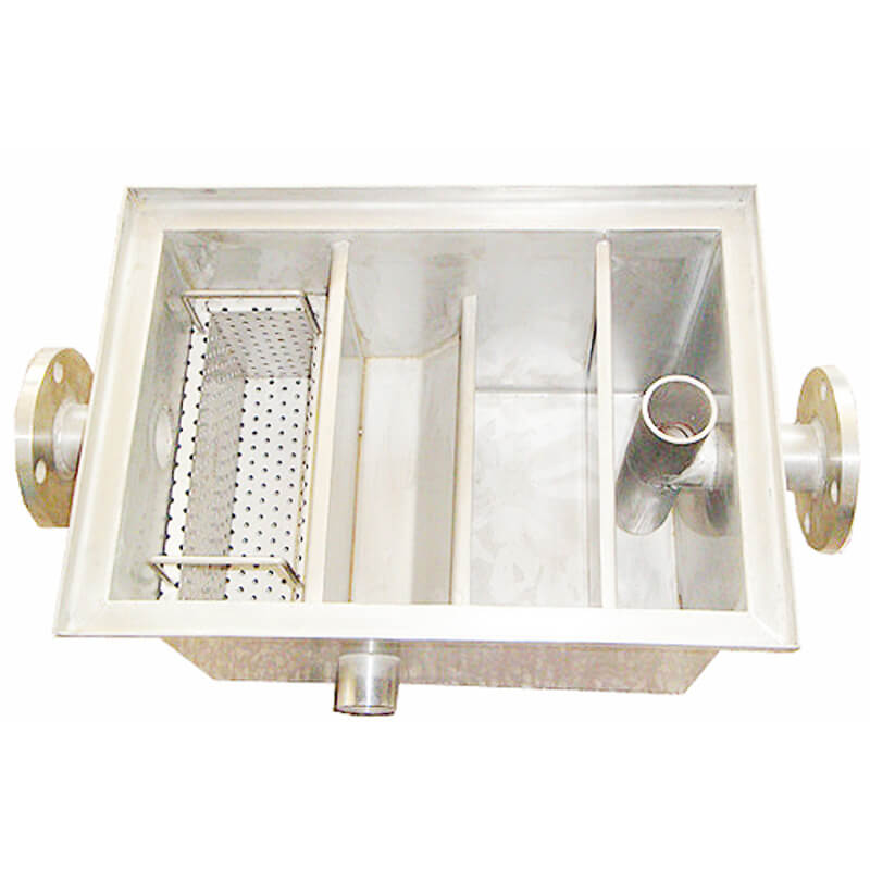 隔油池主要由兩槽'三槽'四槽分別組成,當廚房排水流到第一槽時,雜物框將其中的固體雜物(菜葉等)截流除去,進入第二槽后,利用油水密度差使油水分離。廢水沿第二槽隔油板向下流動,進入第三槽后從物理裝置凈化流出,再經出水管收集排出。第二槽中的油珠顆粒物沿隔油板集聚向上漂浮流動,始終浮在隔油池的第二槽內,經過隔油處理的廢水則溢流入排水渠排出池外,進行后續處理,以去除乳化油及其他污染物。